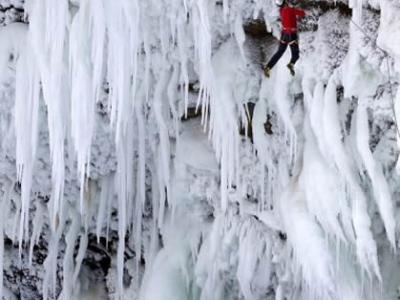 攀登高手冒生命危险征服加拿大137米冰瀑布