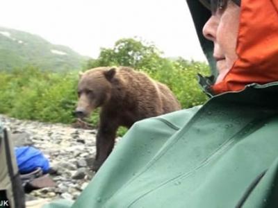 在大灰熊“研究”这群游客时,他们别无选择,只能坐在原处一动不动 从这张照片...