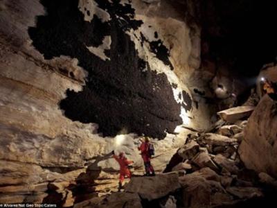 熟睡的蝙蝠:大自然保护协会的成员在田纳西州哈伯德洞穴中检查冬眠中的蝙蝠。摄影...