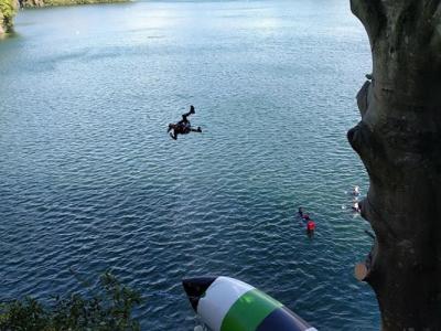 坐在巨型浮床上的人被弹飞上高空再堕入湖中。 跳崖者自制弩弓椅,将人弹射到空...