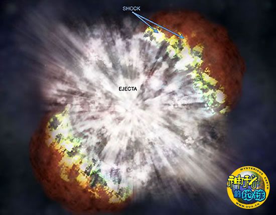 超新星爆发其实就是一颗大质量恒星的“暴死”。对于大质量的恒星,如质量相当于太阳质量的8~20倍的恒星,由于质量的巨大,在它们演化的后期,星核和星壳彻底分离的时候,往往要伴随着一次超级规模的大爆炸。这种爆炸就是超新星爆发。
