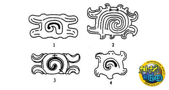 图四 勾云龟形器 1.A型 城子山 2.A型 牛河梁 3.B型 巴林右旗博物馆藏 4.C型 天津市文化局藏