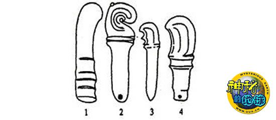 图五 柄形器 1.傅中谟藏 2.北京市外贸公司藏 3.内蒙古林西南沙窝子 4.辽宁省博物馆藏