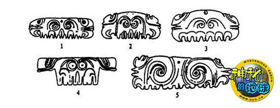 勾云形器是红山文化中最重要的玉器。刘国祥先生将其分为五型。对于各型的缘起和功能,学者们莫衷一是。部分学者一概论之。或认为象鸟,或认为象兽,或认为象龙,或认为是鹿角、猪獠牙的艺术再现,部分学者分而论之。其中ABC三型(图四),陆思贤先生指出A型象蛙、龟一类的蹼足动物。杨美莉先生先生认为象龟。我们同意这种观点,认为此三型器为龟的抽象,可称勾云龟形器。其实这三型与龟的相似性是很明显的。天津文化局文物处所藏C型四足、首尾具全,是最形似者。其他均有龟背和四足。有些学者不同意象龟说,可能主要因为两点:一是很多此类器并没有表现龟的首尾。二是龟背做所谓勾云状,不似真正龟背的平整。联系我们上面讨论的龟与盖天宇宙模式的关系,这两点疑难都可迎刃而解。此类器实际是用抽象的龟型表现盖天宇宙模式,故着意突出像天的龟背和作为天柱的四足,常常省略首尾。而龟背做勾状是象征天的旋转。牛河粱遗址的圆形祭坛和方形积石冢明确表明红山人同样具有天圆地方观念”。在此背景下,此类器像龟就更显合理。龟崇拜并不是本地区的传统,其出现应是受凌家滩的影响,与社会上层间的交流有关,后面会论述。值得注意的是,B型中,巴林右旗博物馆藏品有明确的双耳,与双孔形成类似枭面的形态,台湾故宫博物院藏品也确有陆思贤先生所说的鸟类飞动之态,似乎表明此类器物可能表现的是以龟为主的龟枭合体。