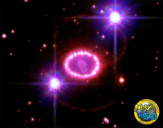 自从1604年发现蛇夫座超新星以后400多年的时间内,人们用肉眼从来没有看到过一颗超新星。1987年2月23日,一位加拿大天文学家在大麦哲伦星云中发现了一颗5等星,它很快就被证实是一颗超新星,立即在世界各国的天文界引起了轰动。 随后的几个月内,这颗被称为1987A的超新星一直光彩夺目,亮度相当于1亿颗太阳。 于是这颗编号为1987A的超新星迅速成为历史上被研究最深入的超新星。这颗超新星距离地球16.3万光年,位于大麦哲伦云中。事实上,它是在公元前161000年左右爆发的,但它的光直到1987年才抵达地球。 哈勃太空望远镜2006年12月拍摄的1987A超新星遗迹。