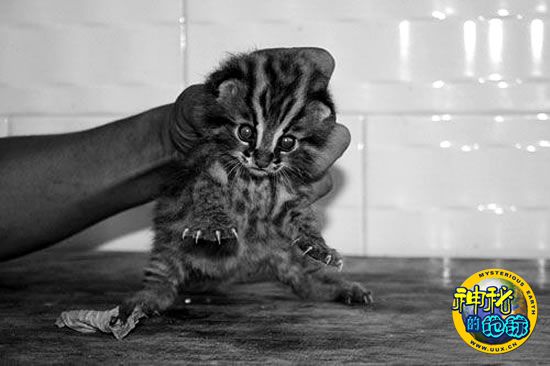 在梅硐镇东河村6组村民张启才家,记者见到了这只不明身份的野生动物。该野生动物全身是乌黑条状的花纹,四肢有锋利的爪子,尾巴细长,鼻尖红色,眼睛蓝色。见到生人就发出如猫一样的尖叫。