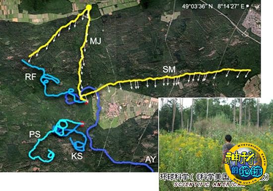 走入丛林。阴天时,当人们在一片森林中穿行时,他们很容易绕着圆圈行走(蓝色路径)。而在太阳可见的晴天时,人们则更容易直线行走(黄色路径)。