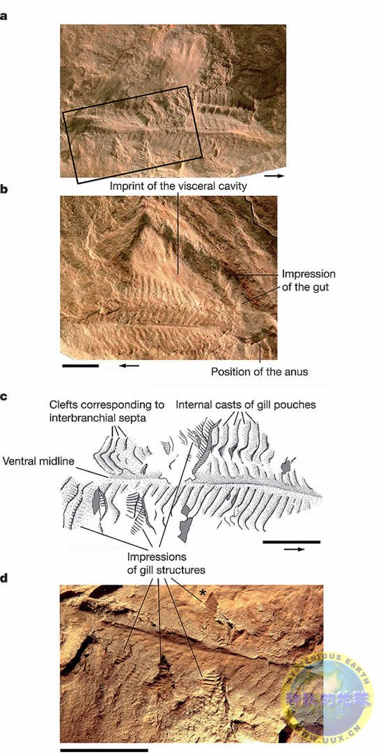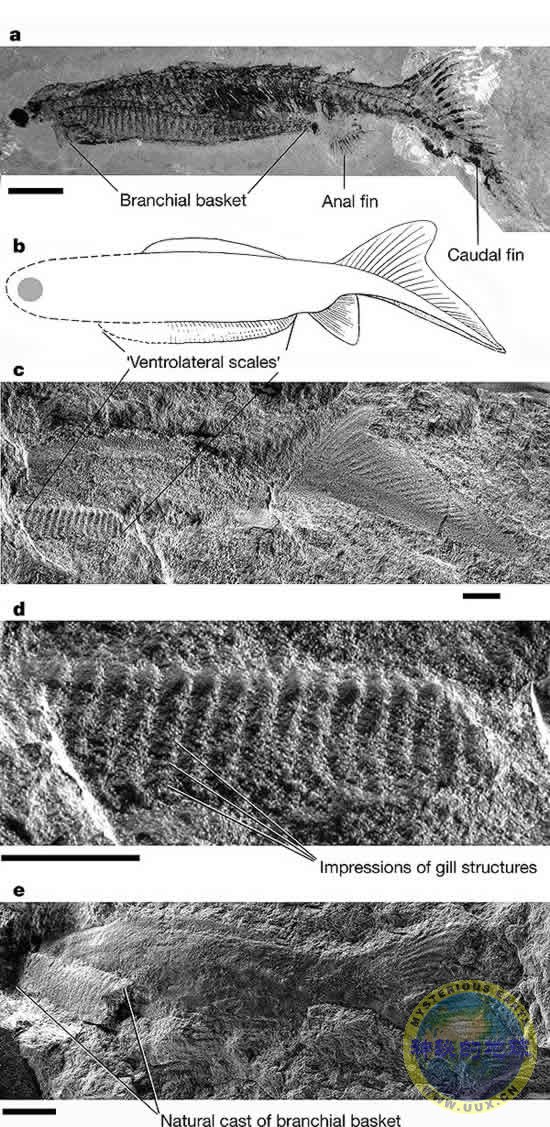 鳃囊见于现存的“圆口纲脊椎动物” (八目鳗类鱼和七鳃鳗)和它们的化石祖先。人们早就怀疑所有无颌脊椎动物都有这种鳃囊,但一直缺乏确凿的证据来支持这种观点。现在,研究人员在一个保存完好的、距今3.7亿年前的Endeiolepis化石中发现了七鳃鳗一样的鳃。这种动物被称为“裸露的无甲类”,因为其身上没有鳞片,所以可能是滑溜的。无甲类是处在演化树根部的有颌类,即与有颌脊椎动物的关系比与圆口纲脊椎动物的关系更近的无颌脊椎动物,所以该发现说明,鳃囊过去曾存在于所有脊椎动物的最后一个共同祖先身上,后来在有颌脊椎动物身上消失了。