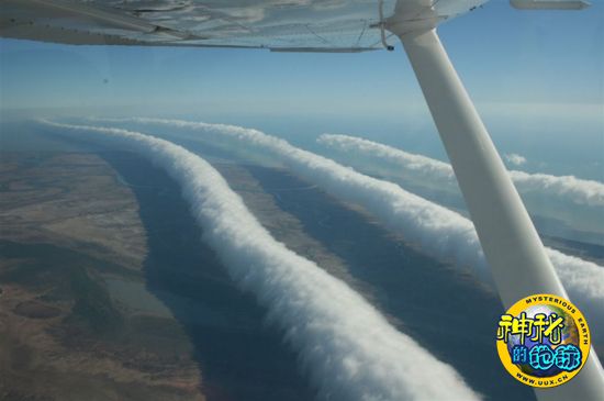 阵晨风云与出现在全球很多地方都会出现的滚轴云的管状相似,但至今无人知道这种云是如何形成的。这张照片是摄影师米克·珀特洛夫在澳大利亚卡彭特亚海湾附近从他们的飞机上拍到的。