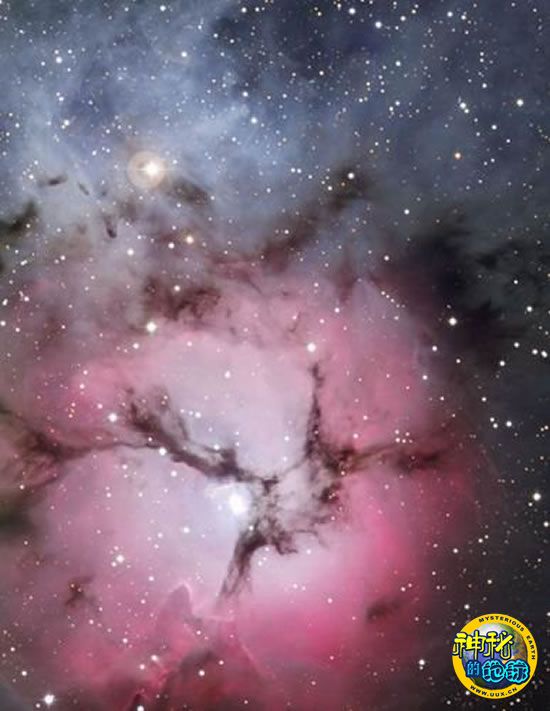 这张照片是由智利欧洲南方天文台(ESO)的天文学家拍摄的,提供恒星生命历程中早期阶段难得的观测机会。新形成易变化的暴力恒星的热量和宇宙风搅乱了犹如充满灰尘的“大锅炉”的三叶星云气体,最终延伸遍布整个宇宙区域的暗色卷曲物质将崩溃并形成新的恒星。