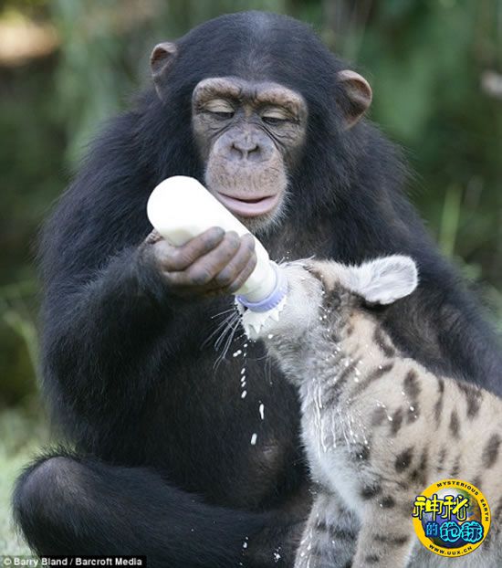 黑猩猩用奶瓶给小美洲狮喂奶