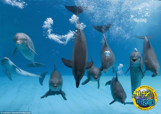 这几只宽吻海豚可谓是水族馆里的明星,能够进行许多高难度表演,不过如果有幸能看到海豚吹泡泡也非常有意思。前不久,意大利摄影师莱安德罗·斯坦扎尼来到海豚馆中给它们摄像,就非常幸运地拍摄到海豚们玩吐泡泡游戏时露出的“微笑”。吐泡泡可算得上是瑞吉欧水族馆海豚最爱玩的游戏了。它们很喜欢先吐出一个巨大的泡,然后用牙齿将大泡咬成许多小泡泡,这些纷纷洒洒的小气泡迅速漂浮到水面上时,甚是好看。据了解世界上共有45种海豚,而宽吻海豚是最常见的。
