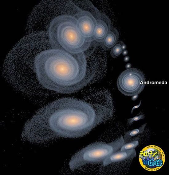 仙女座星系(Andromeda galaxy)是离我们所在的银河系最近的一个星系,距离地球大约250万光年,似乎正在吞噬较小的星系。