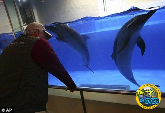 拯救日本海豚协会会长奥巴瑞正在查看被装在水箱里的海豚。他亲眼目睹了太极町地区对海豚的残酷屠杀。