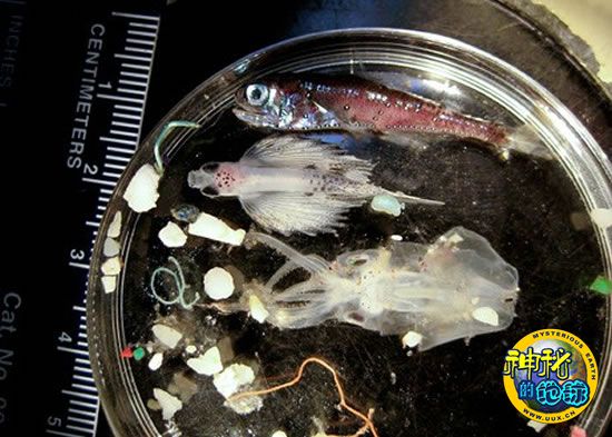 2009年夏季,SEAPLEX科学家在东太平洋垃圾场捕捞到一些动物居民,其中包括蛇鼻鱼(位于图片上方)、飞鱼(位于中部)和乌贼,它们的栖息地到处是塑料垃圾。研究人员急于想知道的是,最近几十年大量流入海洋的塑料垃圾如何影响动物生存,例如包括鱼类和鸟类等误吞有毒塑料的大型动物,以及细菌或浮游生物等微生物。研究人员表示,塑料垃圾也可能成为入侵的细菌或者其它物种的“家”。