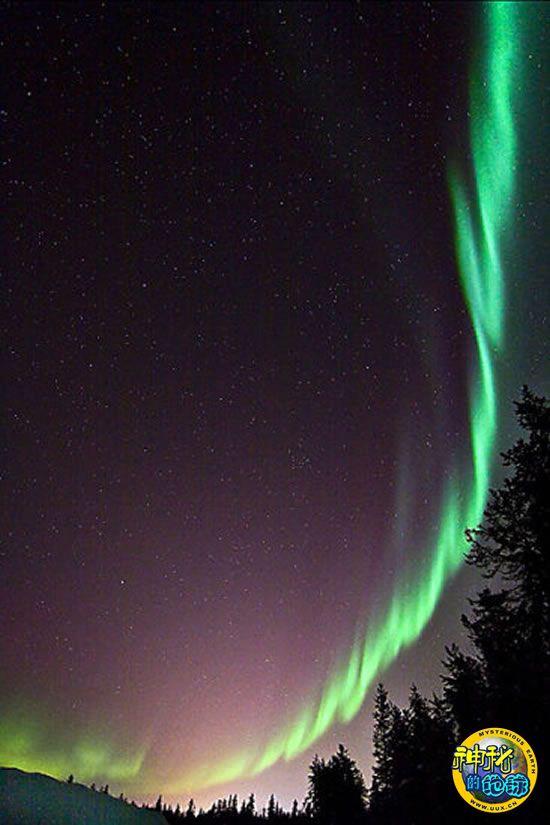 这张鲜艳的绿色弓形北极光图片是由卡尔·约翰斯顿在加拿大一座森林上空拍摄的。