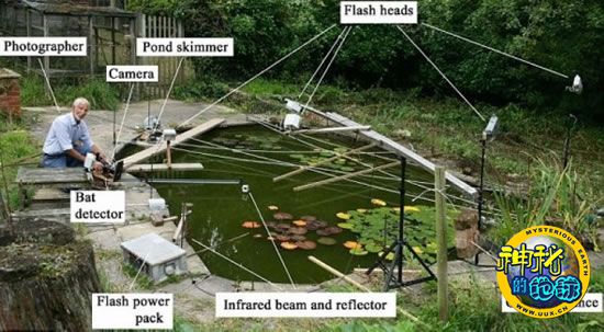 首先他给一部高级数码相机配了一个监听装置,这个装置可以听到蝙蝠发出的超声波。听到蝙蝠的叫声后,它发出一束红外光,在蝙蝠向水面俯冲喝水的瞬间触动相机的闪光灯。