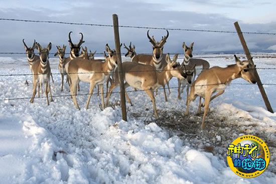 这张图片拍摄于2008年秋季,拍摄地点位于美国怀俄明州格林河上流盆地。图片中,一群叉角羚被一个栅栏挡住了去路。由于无法跳过栅栏,它们被迫从中间慢慢穿过或者从带刺的铁丝下面小心翼翼地钻过,否则的话,它们就要选择后退,放弃已经有着6000年历史的年度大迁徙。