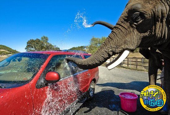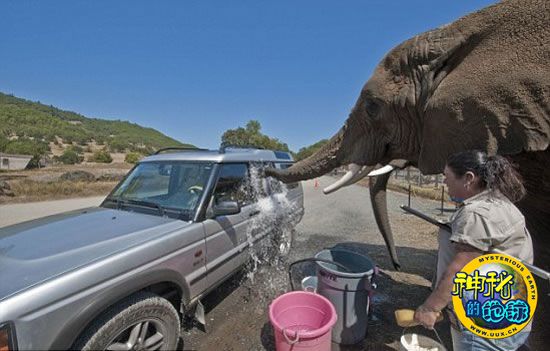 这家公园出租亚洲象爱丽丝和提基为游客洗车,它们用鼻子往车上喷水,然后用海绵拭擦。这种新颖的洗车方式意味着俄勒冈州南部野生动物园的游人们能在车里近距离观看大象为他们服务的这一奇观。