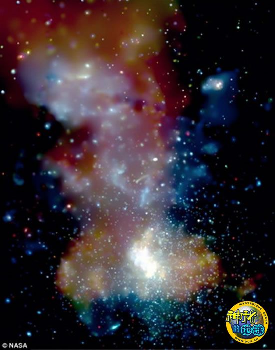 钱德拉望远镜非常强大,因为它能穿透银河系中心发出的阻碍可见光传播的气体和尘埃物质,观测银河深处。这张图是由低能X射线(红色)、能量居中的X射线(绿色)和高能X射线(蓝色)合成的。