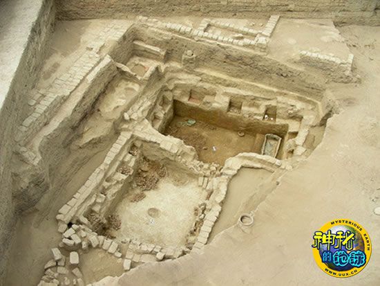 在秘鲁圣何塞摩洛莫切遗址发现的一座双室墓的俯视图。进入2009年以来,考古人员在一个经过装饰的木棺中找到了骆驼骨骼、瓷碗和一名男性莫切精英的遗骸。考古小组负责人卡斯蒂略认为,这名男性同更广为人知的莫切女祭司一起统治着莫切社会。这项发现也支持了卡斯蒂略以前的看法,即前印加时期社会由男性和女性共同统治。