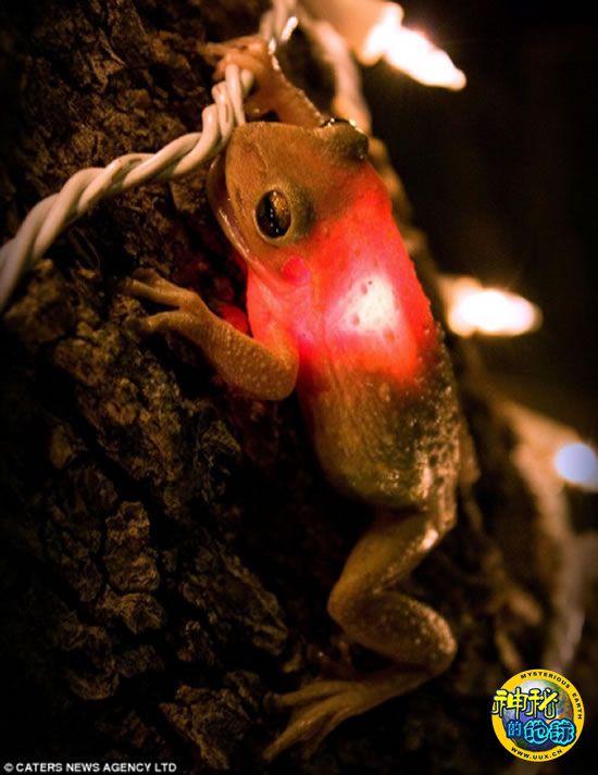 美国佛罗里达棕榈滩的摄影师詹姆士·希德的花园用很多彩灯装饰,一天晚上,他在一棵芒果树上看到了这只亮闪闪的树蛙。他发现一只树蛙吞下了它无法消化的东西。
