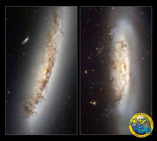 这组图像戏剧性地反映了星系的形成过程,尤其是非常强烈的宇宙风将星系分离时的生动景象,在图像右侧和左侧的明亮蓝色部分是新恒星诞生区域,充分反应了遥远背景星系的状况。