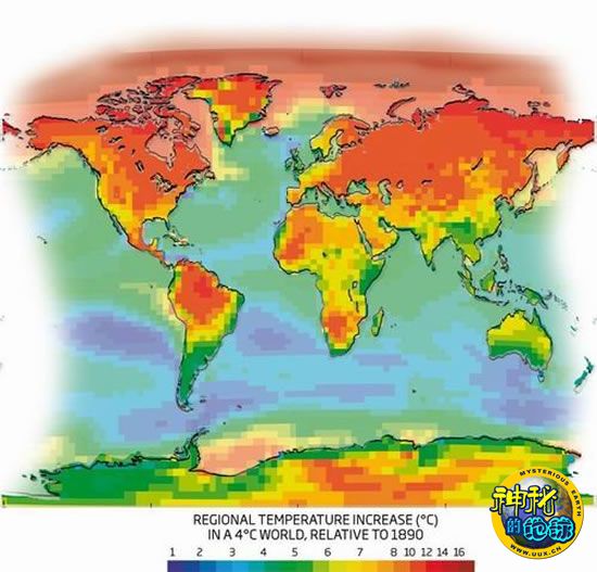 如果到2055年全球气温上升4摄氏度,整个世界将会出现什么变化呢?130多位气候研究员在牛津气候讨论大会上表示,未来的地球状况不容乐观,全球气温平均升高4摄氏度,将导致北极温度上升15摄氏度。德国波茨坦市气候影响研究协会的斯蒂芬-拉姆斯托夫(Stefan Rahmstorf)称,夏季的北极部分地区将像美国加州那帕流域一样温暖,全球海平面将上升1.4米。该协会的乔陈-欣克尔(Jochen Hinkel)指出,即使到2100年海平面仅上升0.65米,也将导致每年有1.9亿人口受到洪水的威胁。