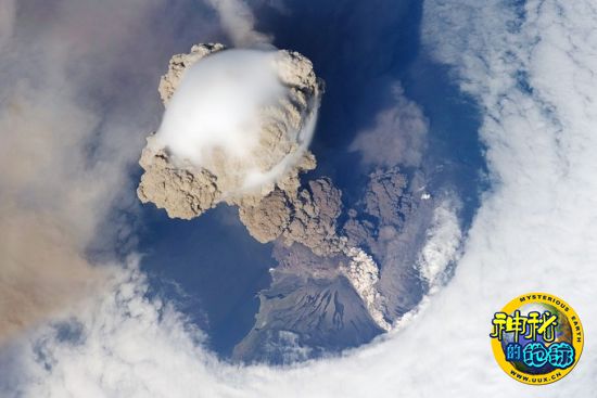 今年6月12日,一位国际空间站的航天员在太空拍到了地球一座火山爆发时的照片。照片中爆发的火山是Sarychev火山,它位于日本东北部千岛群岛的松轮岛。照片中由褐色火山灰和白色水蒸气形成的巨大云柱直冲天空,云柱顶端呈现出帽子的形状,因而被称为帽状云。