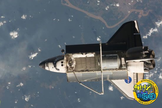 图片显示的是,在2009年9月,成功完成STS-128任务的发现号航天飞机脱离国际空间站,准备返回地球。发现号的货物舱门仍然开启着,能够看到其中的莱昂纳多多功能后勤舱。