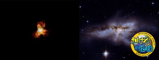 分别显示的是钱德拉天文望远镜观测到的X射线数据和哈勃太空望远镜拍摄的NGC 6240可见光照片。