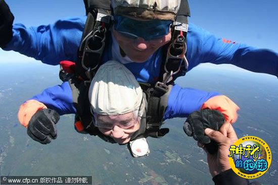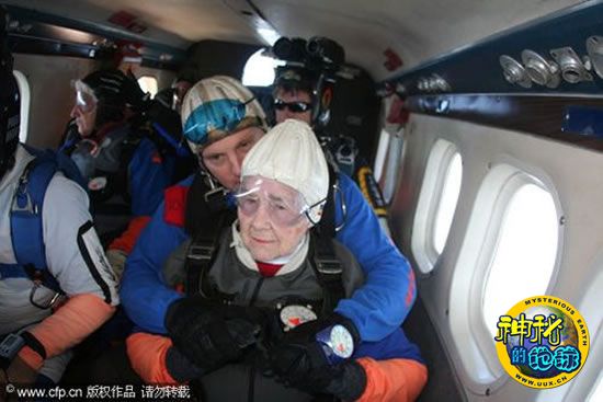 92岁老太从13000英尺高空跳伞 来源: 神秘的地球 时间:2009年10月09日 11:11 92岁老太从13000英尺高空跳伞 2009年9月19日,曾结过7次婚的92岁曾祖母简在家人和朋友的注视下,绑在身后跳伞运动员的身上,从13000英尺的高空跃下,完成了跳伞壮举。说到这次挑战的理由,不过是简的一个突发奇想而已。 CFP 上一篇 下一篇 TAG: 跳伞