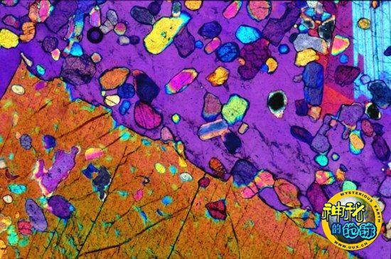 2009年尼康微观世界摄影大赛获奖名单 来源: 神秘的地球 时间:2009年10月09日 14:47 9.辉长岩中黄绿色晶体 辉长岩中黄绿色晶体 作者:伯纳德·塞萨尔博士 放大倍数:5倍 辉长岩是一种侵入性火成岩,形成于地下深处熔化的岩浆房。我们肉眼可以看到辉长岩的粗粒结构(通常呈黑色),在这张照片中,伯纳德·塞萨尔(Bernardo Cesare)博士通过显微镜让我们看得更清楚。他说:“这个样本中含有数量罕见的大块晶体,让我们从中看到了多种惊人的色彩。” 1...上一页78910111213141516...20下一页 上一篇 下一篇