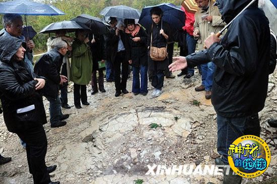 10月8日,在法国东南部城市里昂附近的普拉涅,皮埃尔·昂斯佩尔格教授指示地面上的“恐龙足迹”。