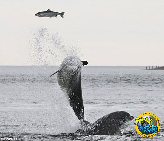 这两只海豚似乎也非常享受与猎物玩耍的乐趣,这条大马哈鱼不断跃出水面,在海豚上方高高飞过,极力尝试逃走,但它最后不得不承认失败,没能逃脱成为海豚食物的命运。
