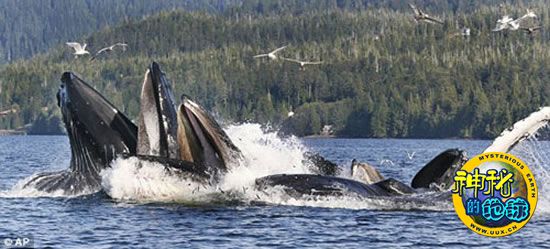 在美国阿拉斯加州,六头驼背鲸也与一些海鸥上演了一场追逐美味青鱼的激战。当这些青鱼尝试躲避水中可怕的鲸鱼而破水而出时,海鸥就看准机会突然下扑,与鲸鱼抢夺猎物。
