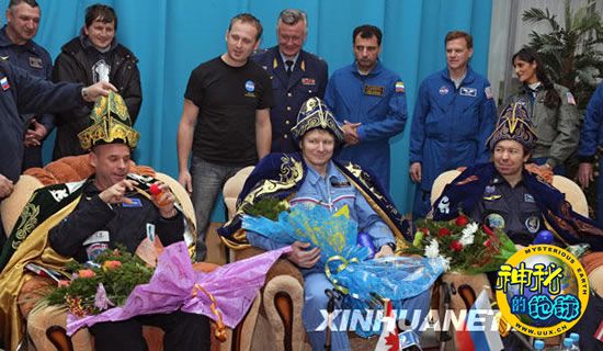 10月11日,加拿大太空游客盖·拉利伯特(左)、宇航员根纳季·帕达尔卡(中)和迈克尔·巴拉特出席在哈萨克斯坦举行的记者招待会。