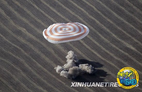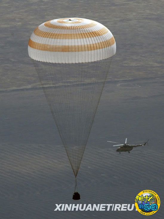 俄罗斯电视台画面显示,返回舱挂在一把橙黄色与白色相间的巨大降落伞下,飞向地面。着陆后,俄罗斯宇航员根纳季·帕达尔卡率先出舱,坐在躺椅上喝了一杯茶、咬了一口大苹果,对着问候他的地面工作组连声说“谢谢”。