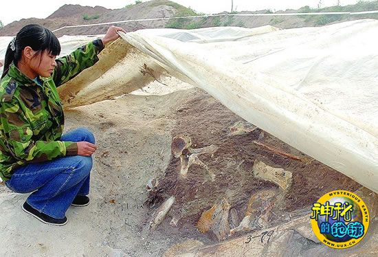 塑料布下是新发掘的化石带 ,化石非常多且裸露在外。