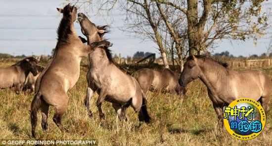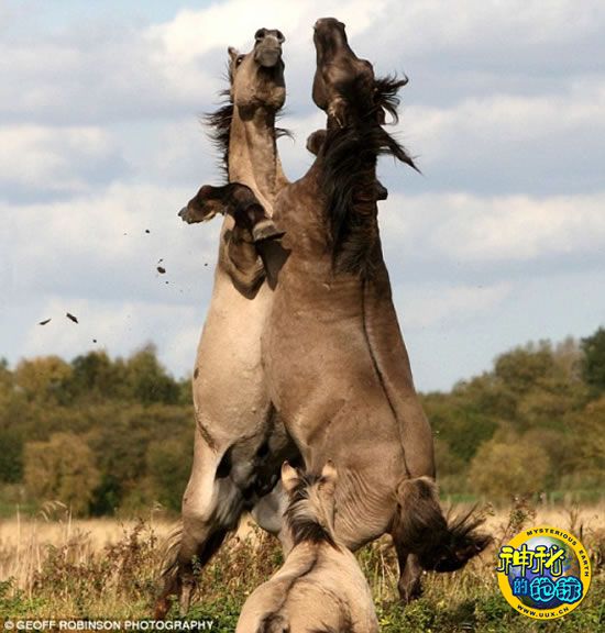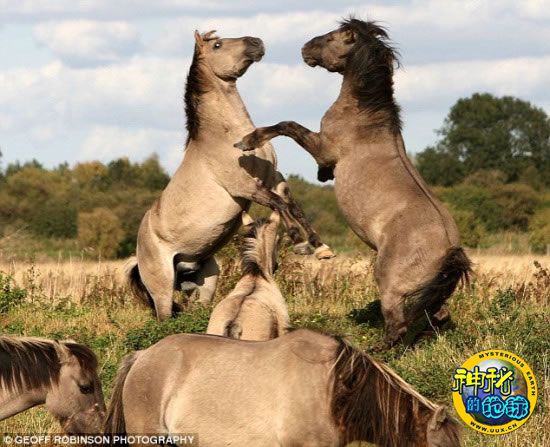 这两匹科尼卡野马(konik)曾是青铜器时代驰骋在欧洲的一个史前马种的近亲,当它们在剑桥郡威肯自然保护区的沼泽地缠斗时,有人用摄像机拍下这一幕。