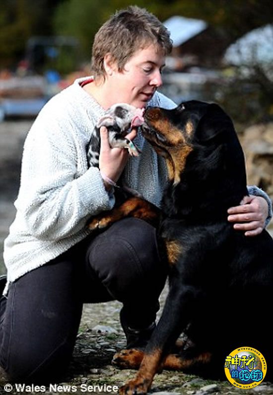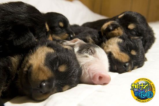 这只小猪叫“苹果沙司“,因为在妈妈的13个孩子中它发育不良,所以被妈妈的遗弃,苹果沙司眼看就要饿死了。动物爱好者海蒂·蕾哈恩希望她的宠物、刚产下8只小狗的罗特韦尔犬萨沙能帮一帮这只小猪。看到萨沙接受了小猪苹果沙司,他们全家高兴极了。海蒂说:“看到这只小猪依偎着一只大型罗特韦尔犬和它的幼崽,那是一种奇怪的感觉。萨沙的母爱本性让它拯救了苹果沙司。”