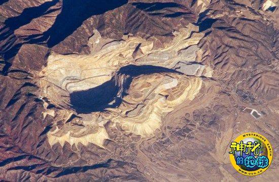 宾翰铜矿位于美国盐湖城郊20英里(约合32公里)处的奥克尔山(Oquirrh Mountains),自开采以来,铜总产量已超过1800万吨,在世界首屈一指。这个铜矿宽2.75英里(约合4.4公里),深4000英尺(约合1.2公里),即便将两座帝国大厦堆叠在一起,也不能到达山顶。到2015年,宾翰铜矿的深度将达到4500英尺(约合1.37公里),届时,又可以放下一座帝国大厦了。铜矿内的台地可能有80英尺(约合24米)高,一方面用作挖掘设备的基地,另一方面稳固一层层斜坡。宾翰铜矿于1904年开始采矿,也被美国命名为历史遗迹。这张照片由国际空间站上的宇航员用数码相机拍摄于2007年9月20日。