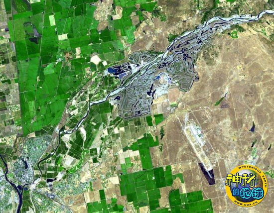 尤巴河的清淤工作始于1893年,不久以后,矿业公司开始筛选和再筛选残渣,从中提取出更小的金粒。到1970年,所有容易开采的金矿全部被采完,随后则是开采沙砾以生产水泥。今天,尤巴河周围土地的所有权分散在矿业公司、私人和政府手中。这张照片是2001年8月29日由美宇航局Terra卫星上的先进星载热发射和反射辐射仪(ASTER)拍摄的。