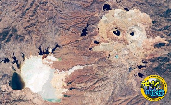 卡纳尼阿矿(Cananea mine)位于美国同墨西哥索诺拉边境以南25英里(约合40公里)处。照片上方右侧的卡罗拉达矿坑(Colorada Pit)宽为1.6英里(约合2.5公里)。它是世界上最大的铜生产商,同时也开采金矿。这两种金属通常在岩浆涌向叠压基岩的地方一同被发现。岩浆在那里结晶,而炽热的流体经其不断循环,进入周围岩石的石缝,改变了岩石的特性,产生富含铜的矿石和金子。1906年卡纳尼阿矿工大罢工变成暴力事件,有19人在冲突中丧生,也成为1910年墨西哥革命的导火索。卡纳尼阿矿的另一次罢工是在2007年。这张照片是国际空间站上的宇航员在2008年3月3日拍摄的。