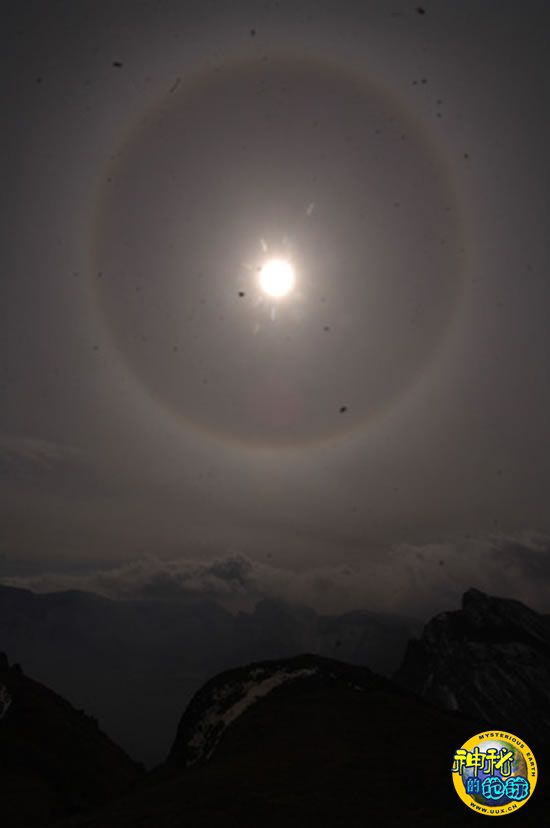 圆虹是日光透过云层中的冰晶时,经折射而形成的光学现象。据了解,当天空中出现卷层云时,空中飘浮着无数冰晶,在太阳周围的同一圆圈上的冰晶,就能将各种颜色的光折射到人的眼中而形成晕环。这次出现的长白山圆虹,外圈呈内红外蓝,中间杂有淡黄色和紫色,蔚为壮观。