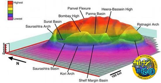 这张图是科学家用3D形式描绘出的印度湿婆陨石坑的全景。科学家估计湿婆陨石坑就是由引起恐龙灭绝的那次陨石碰撞而形成的