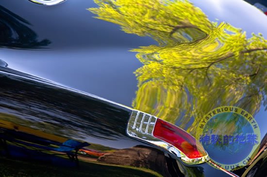 A swirl of spring cottonwood trees and other shapes is reflected on the surface of a shiny black Buick in Moah, Utah.