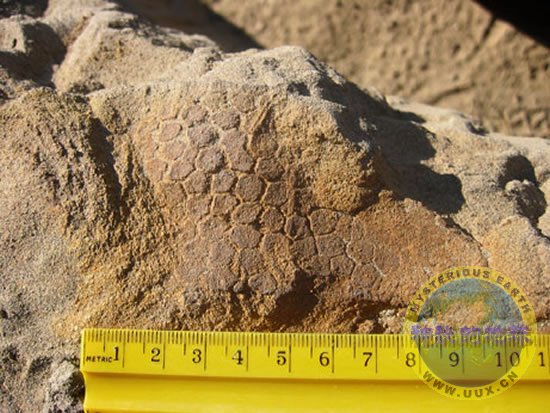 The skin of a duck-billed dinosaur pokes out of the soil at Hell Creek Formation in North Dakota.