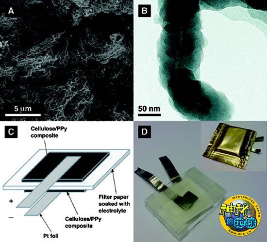 这种新型电池由两个纤维素电极及夹在其间浸过盐水的滤纸构成,看起来就像一个三明治,两个纤维素电极位于两块载玻片之间。两极上附有铂带与外界形成导电接触。在聚吡咯内发生的化学变化存储和释放电量,分子在其中以两种形态存在,也就是术语所称的“氧化状态”和“还原状态”,当这两种状态的分子形成回路时,即产生电流。该电池可在几秒内完成充电,而且充放电100次后的性能也不会出现较大的损耗。