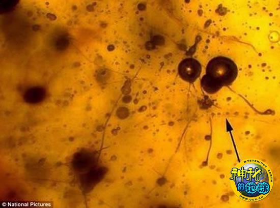 显微镜显示琥珀中的蜘蛛网片断和蜘蛛粘液(箭头所示)